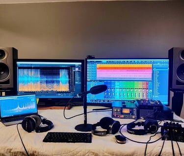 Here is a pic taken in my studio showing most of the hardware I use when doing post production. As I discuss below, however, the most important "ware" in a post production studio is software not hardware. Critical in the software library of a good post production studio is a technology called "room calibration" discussed below.
